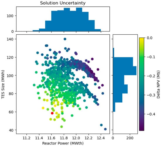Due to the stochastic nature of HERON, the optimized solution for each run is different. The optimizer itself also adds uncertainty to the solution. To see this sensitivity, the same optimization was run 1000 times, leading to 1000 different optimized solutions. Figure 15 shows a scatter plot of the results and the distribution of the resulting reactor and TES sizes. The reactor power distribution is relativity tight, whereas the TES capacity shows higher variance. The NPV of each result is shown as a NPV, with the point in red being the result with the max NPV. The results show a relatively large range of TES sizes, from as low as 40 MWhth to 140 MWhth, though most results are in the 70–120 MWhth range. The reactor results are much more clustered, ranging from 11.3 to 12.5 MWth. There is a clear gradient with the results for the NPV; the lower TES sizes have higher NPVs, though there is a relatively small USD 0.5M difference between the best and worst results. This shows that the optimizer tends to overestimate the size of the TES that is required. The result with the highest NPV had a reactor size of 11.61 MWth and a TES size of 58.41 MWhth. The standard deviation was 0.22 MWth for the reactor size and 11.89 MWhth for the TES system.