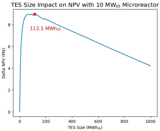For a 10 MWth reactor, the optimized TES size is 113.1 MWhth. The effect of TES size on the NPV is shown in Figure 16, with the NPV of the case with no TES set equal to zero. Even a small amount of TES allowed the reactor heat to be better utilized, greatly improving the NPV. The NPV increased until the optimal point, and then it began to decrease as the marginal improvement of reactor utilization became less than the cost to install more TES. Because of the reduced reactor capacity relative to the optimal point, the diesel utilization increased from 5 to 13.4%.