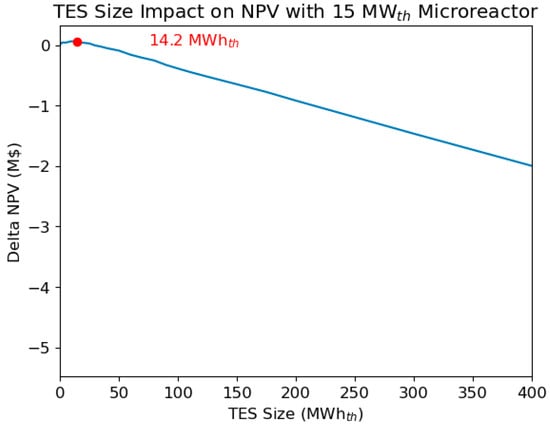 The curve for the 15 MWth reactor followed a similar trend but with an optimized TES size of 14.2 MWhth. This is because a 15 MWth reactor was oversized for the majority of the clusters, so the TES was less useful, resulting in the relatively large size difference for the TES systems for the two cases. Because the reactor size was greater than the optimized size, diesel utilization dropped to 0.16%. As shown in Figure 17, the NPV of this case was lower than that of the 10 MWth case.