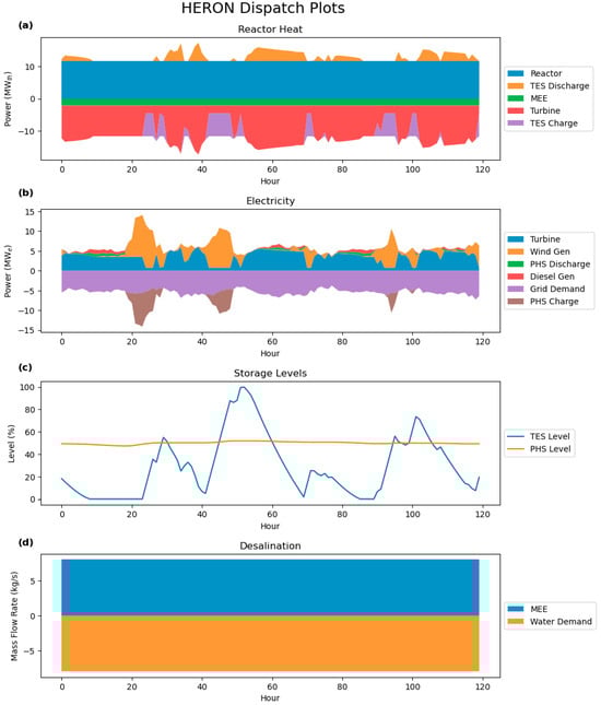 Using the optimized capacity, the dispatch for a single cluster was plotted (Figure 18a–d). Figure 18a shows the reactor heat production and usage over the course of the cluster length. The reactor produced a constant amount of heat for the entire cluster length, the MEE system used a constant amount of heat, and the turbines used a variable amount of heat depending on the electrical demand and the amount of wind generation in the system. Excess heat was stored in the TES system and dispatched later when more heat is needed.
