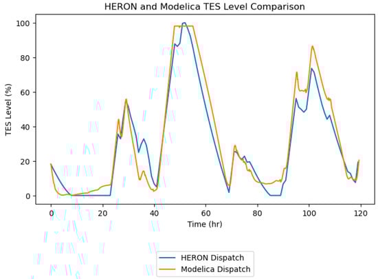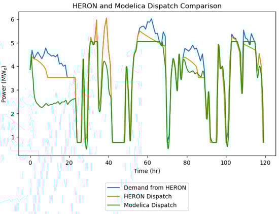 Figure 19 shows the electrical demand signal from HERON and the dispatch from HERON and Modelica. The Modelica dispatch matched that of HERON for most of the simulation time, with a few exceptions. During the first 24 h, the Modelica model under-generated electricity. This was due to the HERON surrogate model calculating a lower heat load than the dynamic model, causing the dynamic model to empty the storage more quickly, further reducing the power output in the dynamic model. Further along in the simulation, there were several times when the Modelica power flatlined due to the physical limitations of the BOP, which were determined by the turbine sizes used in the model. This comparison indicates that HERON is likely underpredicting the amount of diesel needed. One limitation of HERON is the need for the storage level to start and end at the same level; as a result, for many of the clusters with higher power generation than demand, HERON will dump some of heat to waste when it could instead charge the TES. One important validation in this comparison is that the dynamic model can meet the high ramp rates of the system.