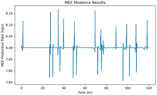 A complete microgrid was modeled with the microreactor, TES, BOP, and heat application. The Modelica model for microgrid is shown in Figure 8. Historical electrical demand data were used as the input demand for the model, and a constant demand of 8 kg/s, or ~10% of current freshwater usage, was used for the MEE system. This amount was chosen as it is low enough to not overly reduce the efficiencies of the CHP plant while still being enough to provide a significant amount of fresh water. Realistically, any amount of water production could be chosen, though it would affect the overall efficiency of the system. Increasing the amount of water production would cause the BOP to operate in bypass mode rather than extraction mode more often or would require the BOP to be redesigned as a back-pressure configuration.