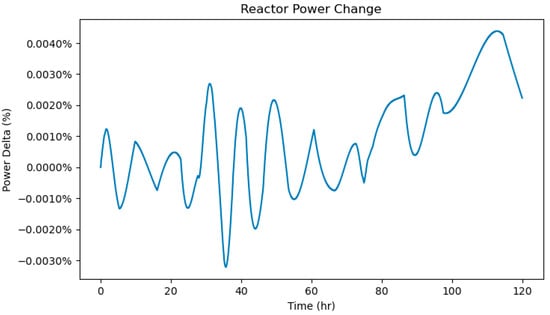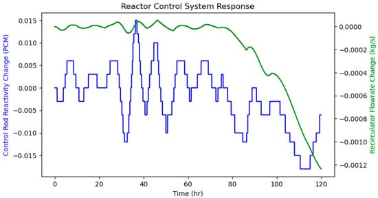 The control system’s response to achieve this low power change in the reactor can also be analyzed (see Figure 23). Both the control rods and the helium recirculator used only minimal adjustments to maintain the core power. This again shows that the primary factor stabilizing the reactor is the TES system, with its constant charge rate.