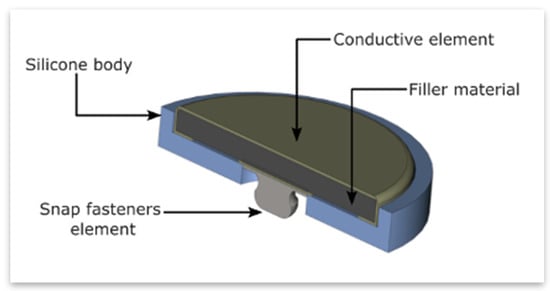 In the LETS system vest, electrodes Figure 2 made of silicone conductive material with a specific resistivity = 50 Ωcm are employed. These electrodes offer better adaptation to body contours and enhanced adhesion, significantly reducing patient movement’s impact on the measured signal. Due to these properties, such electrodes are widely used in devices for electrical stimulation, such as TENS/EMS and electrical impedance tomography (EIT). The silicone material used for these electrodes also ensures high precision and reliability in biosignal measurements, contributing to improved quality of analyzed medical data.