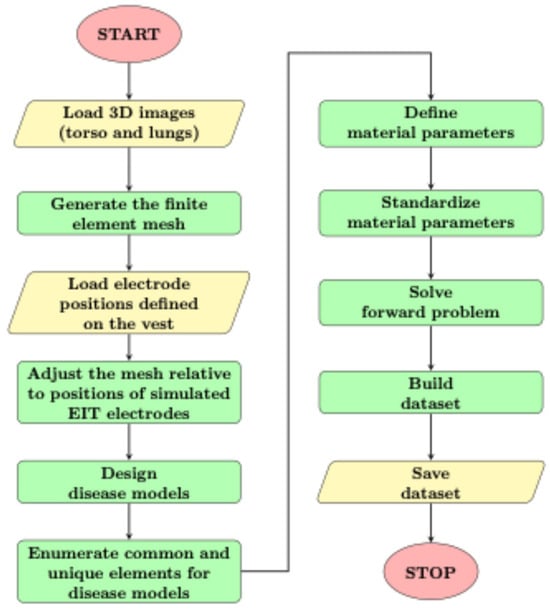A model of the male torso based on computer tomography (CT) images has been considered. Following the segmentation process to isolate the torso and lungs from the background, the next step involves generating a mesh composed of tetrahedral elements. A comprehensive description of the mesh generation procedure and the subsequent stages of data processing has been provided (Figure 4). The main steps are generating the finite element mesh, enumerating common and unique elements for disease models, defining material parameters, and solving the forward problem.