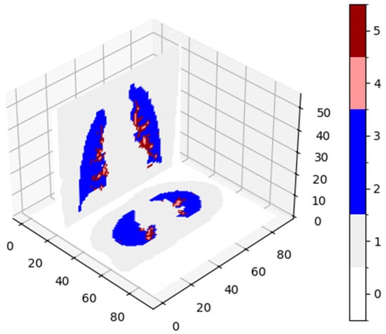 Figure 5 presents the central cross-sections of the model for a healthy case, showing projections onto the Oxy and Oyz planes. Image segmentation was employed to identify areas assigned to the lungs and bronchi. A morphological dilation operation was utilized to delineate the region approximating blood vessels. Figure 6 presents all diseases.