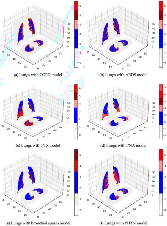 In Figure 6a, the lesion is the red region; it is damaged lungs for very small bronchioles. Figure 6b presents a model with ARDS lesions, which are small changes throughout the lungs, simulating extravascular water in the lungs. Figure 6c presents a reduced left lung, the air in the pleura (red color), and a healthy right lung. Figure 6d shows PNA lesions on two levels (index 6 and 7). Figure 6e simulates bronchospasm lesions with pathological change in distinct areas assigned to the bronchioles (index 4). Figure 6f is a model of PHTN disease; index 5 is responsible for enlarged blood vessels.