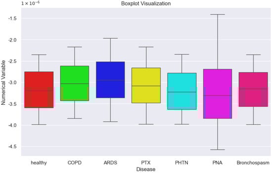 The dataset used for training consisted of 10,500 cases, with 1500 cases per class, while the testing set comprised 3151 cases, approximately 450 cases per class. An analysis of class distributions indicated that most cases showed similar distributions, except for the PTX class. The ARDS group of patients displayed a higher median, highlighting significant inter-group differences (Figure 7). The diversity within distributions and the presence of outliers presented challenges in classification, reflecting the complex nature of these data.