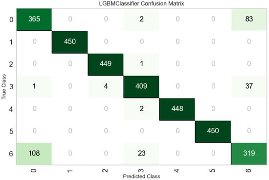 Confusion matrix for LightGBM model. 0—healthy, 1—COPD, 2—ARDS, 3—PTX, 4—PHTN, 5—PNA, and 6—Bronchospasm (source own).