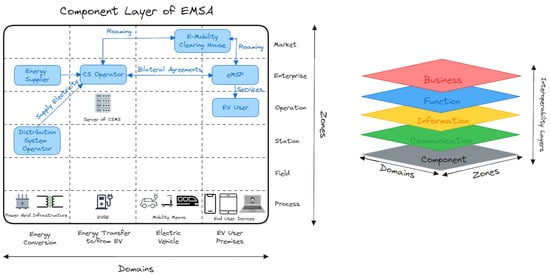 On the left side of the figure lies the component layer within the EMSA model, delineating the diverse zones and domains constituting the electric mobility ecosystem. Represented by blue boxes are the actors and stakeholders, interconnected by arrows to showcase the dynamic relationships among them. On the right side, the EMSA model unfolds its five interoperability layers, commencing from the uppermost tier, business, and cascading down to the lowermost tier, component. Each layer embodies distinct functionalities and interactions crucial for seamless operations within the electric mobility landscape.