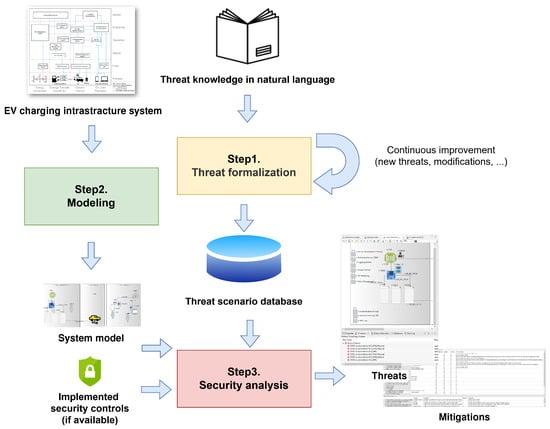 In this section, we will elucidate the three key methodological steps integrated into our framework, as illustrated in Figure 2. Our approach begins with formalizing security threats using object constraint language (OCL). Concurrently, we develop the EV system model under examination utilizing the EMSA model. These two components then feed into our framework for conducting the security analysis. We will now provide a detailed explanation of each of these three steps individually.