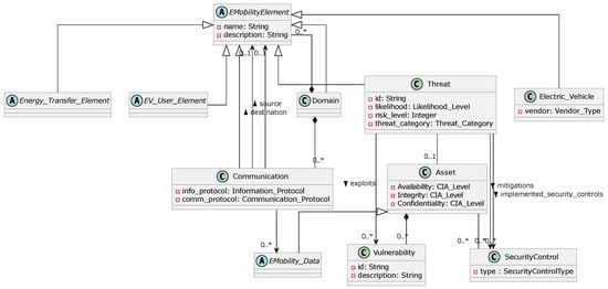 Our conceptualization is presented as a metamodel, the e-mobility metamodel. Its goal is to define the concepts for the development of the e-mobility systems architecture which will help describing the EV charging infrastructure. The main concepts introduced in the metamodel are presented in Figure 4. At the core of the metamodel is the EMobilityElement abstract class, which serves as a base for various other elements. The Asset class is characterized by attributes representing the levels of confidentiality, integrity, and availability (CIA_Level). It is closely associated with multiple SecurityControl and Vulnerability instances. The Communication class, detailed with attributes like info_protocol and comm_protocol, represents the protocols used in information exchange and communication within the e-mobility system. It links to EMobilityElement instances as both source and destination interact with multiple EMobility_Data elements.