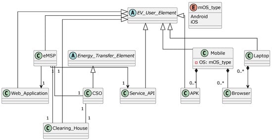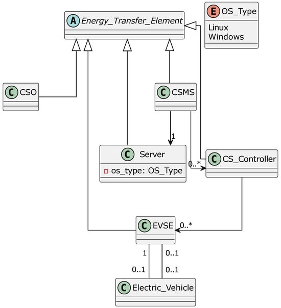 The following paragraph describes the e-mobility metamodel from three points of view: energy transfer element, EV user element, and e-mobility data. The first view (Figure 5) captures the various components and their relationships within the energy transfer system of e-mobility. Energy_Transfer_Element abstract class, is the base class for different elements such as CSO, CS_Controller, CSMS, Server, and EVSE. The charging station operator (CSO) and charging station management system (CSMS) are key elements in this view. The CS_Controller class manages the connection and interaction with multiple EVSE instances, indicating the charging points or electric vehicle supply equipment. The CSMS establishes a relationship with the CS_Controller, managing one or more controllers, and is directly associated with exactly one Server. The EVSE can be linked to a single Electric_Vehicle, representing the physical charging infrastructure.