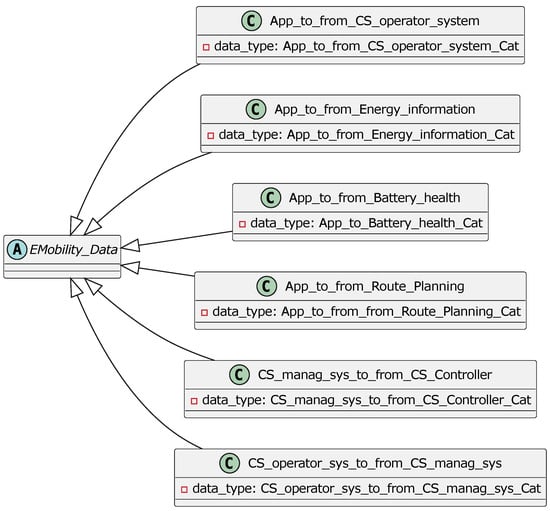 The e-mobility data view (Figure 7) encapsulates the various data types and their relationships within the e-mobility ecosystem. Each subclass of EMobility_Data represents a distinct category of data exchanged within the e-mobility framework. For instance, App_to_from_CS_operator_system includes attributes defined by the enumeration App_to_from_CS_operator_system_Cat, such as GPS coordinates, radius value for filtering charging stations, and charging station IDs. Similarly, App_to_from_Energy_information comprises data types specified by App_to_from_Energy_information_Cat, including country code, start and end times, percentage of renewables, and energy market price.
