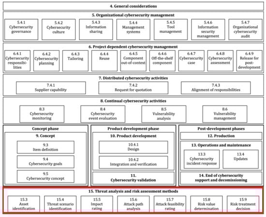 - Costantino, G.; De Vincenzi, M.; Matteucci, I. In-depth exploration of ISO/SAE 21434 and its correlations with existing standards. IEEE Commun. Stand. Mag. 2022, 6, 84–92. [Google Scholar] [CrossRef]