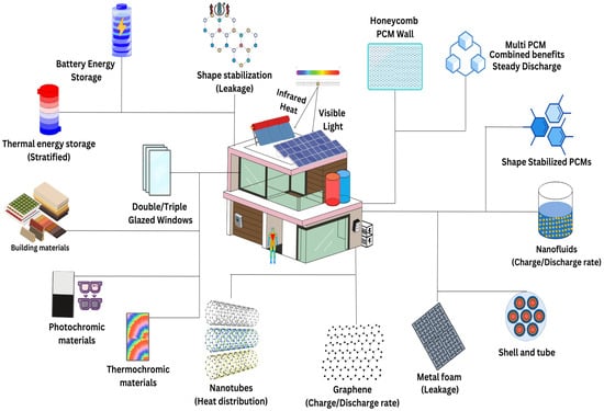 Phase change materials (PCMs) were first investigated in the 1940s by researchers Telkes and Raymond. However, their potential was not widely recognized until the energy crisis of the 1970s, which spurred renewed interest in PCMs. By the early 1980s, extensive research had been conducted to explore their applications, with a particular focus on solar energy systems [24,25,26,27,28,29,30,31,32,33,34,35,36]. The research into PCMs as thermal energy storage (TES) has since expanded to cover a broad range of applications. Significant contributions have been made in the fields of building air conditioning [37,38,39,40,41,42,43,44], solar heating [45,46,47,48,49], electronic cooling [50,51,52,53,54], waste heat recovery [55,56,57,58], textiles [59,60,61], construction and buildings [62,63,64,65,66], food and drink [67,68,69,70], and agriculture [71,72,73,74,75,76], among others. Holistic use of PCMs integrated with solar thermal storage, hydronic heaters, and other sustainable technologies for residential applications aids in building temperature regulation and thermal energy management. PCMs offer a robust solution for managing surplus solar energy and dealing with the duck curve phenomenon by leveling the load and enhancing solar energy ride-through capability, thereby ensuring a more stable and reliable decentralized energy grid. Advances in nanocomposites, microencapsulated PCMs, and shape-stabilized PCMs are being extensively studied with potential for application in nanogrid architecture, which will be discussed in each subtopic.