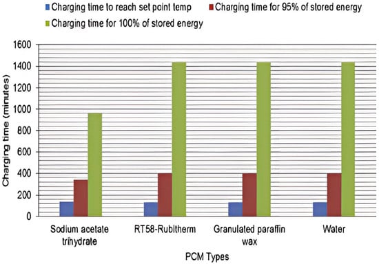 In a numerical study conducted with TRNSYS, a domestic hot water tank was coupled with a thermal energy storage (TES) module containing phase change materials (PCM). The results demonstrated that integrating PCM effectively improved the tank’s energy storage density. The optimal PCM was identified as a 10% graphite and sodium acetate trihydrate composite due to its superior storage potential. Key considerations included the thermal conductivity and thickness of the PCM module, as well as ensuring safe and durable containment. The study demonstrated that PCM integration not only enhanced energy density but also effectively met energy, load shift, and peak power demands [143]. The integration of PCM in hot water tanks within residential nanogrids enhances energy storage density, enabling effective load shifting and peak demand management. This leads to optimized thermal management and reduced reliance on instantaneous heating. Figure 3 illustrates the charging durations for a variety of PCMs.