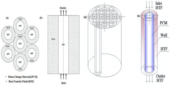 Researchers in the study [194] explored a shell and tube thermal energy storage (TES) system for district heating, using paraffin (RT100) as the phase change material (PCM) and water as the heat transfer fluid (HTF). Their findings revealed that a paraffin/graphite composite with 15% graphite content exhibited impressive performance. The configuration included vertically arranged HTF pipes in a 15 × 15 matrix. The addition of expanded graphite improved the thermal conductivity of the storage medium, maintaining the PCM’s essential thermophysical properties. The TES system reliably met heating demands ranging from 130 kW to 400 kW, depending on the operating conditions. Figure 5 illustrates a shell-and-tube PCM thermal energy storage unit.