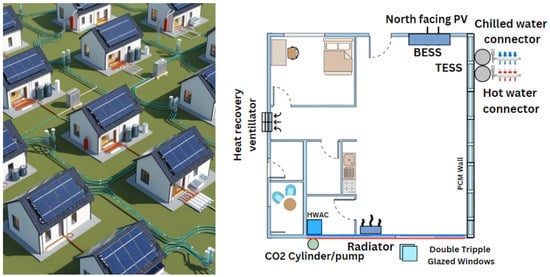 Nanogrids are residential houses that utilize local renewable energy sources and storage solutions to operate in islanded mode or non-islanded connected to the main grid. Nanogrid houses are gaining traction owing to trigeneration, polygeneration, and multigeneration concepts being investigated at residential scales. There are AC, DC, and hybrid AC/DC nanogrid variations being studied. DC nanogrids are found to be more efficient [15] but are preferred to be implemented in remote communities [16] or new communities. The major challenges that exist in the widespread penetration of nanogrids are the lack of smart grid standards dealing with decentralized architectures such as nanogrids, low inertia, and the requirement for electrical (Li-ion) and thermal energy storage (PCM, insulated tanks) [17]. Other thermal storage options for nanogrids also include Carnot batteries [18] and hydrogen storage. High-energy dense (PCMs) are best suited for residential nanogrids with space limitations because of their energy density capabilities. On a wider scope, nanogrids and microgrids offer ancillary services to the wider grid. Integrating nanogrids with thermal energy storage systems such as PCM and sensible heat storage entails addressing several challenges across technical, economic, social, and regulatory domains. Technical issues include energy management protocols/solutions to optimize use and maintain reliability [19], the intermittency and stability of local intermittent generation [20], and thermal energy storage efficiency [21]. Economic challenges involve high initial investment costs [22]. Regardless of the challenges, nanogrids are now being studied, integrating diverse technologies, including phase change materials within building walls, to decrease energy demands for HVAC applications.