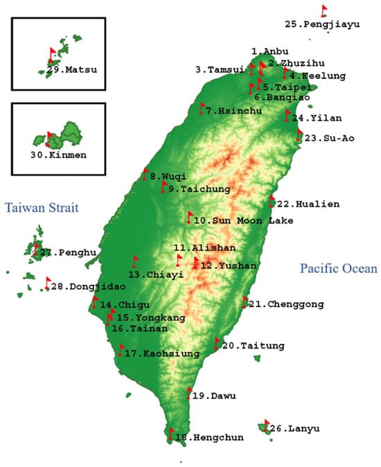 Beam radiation data are essential for energy assessments in concentrating solar applications, which are sometimes used in large-scale systems. However, no beam and diffuse radiation information is provided in the daily reports from all weather stations of the Central Weather Bureau (CWB) of Taiwan. Recently, a nationwide database has been established for global solar radiation for the typical meteorological year (TMY), using data from 30 CWB weather stations across the terrain of Taiwan [5]. Of these, twenty-four stations are located on the Taiwanese mainland (Stations 1–24), while the remaining six (Stations 25–30) are situated on various remote islands, as shown in Figure 1 and Table 1. This development marks a significant step forward in providing the necessary data for accurate energy assessments. Ground measurements for global solar radiation in monotonous, low-lying landscapes are generally reliable within a few tens of kilometers. However, in areas near the sea, urban centers, or rapidly changing landscapes such as mountains, this reliability may be restricted to just a few kilometers. Figure 1 illustrates that mountains and hills cover nearly two-thirds of the Taiwanese mainland. Five mountain ranges, referred to as the Central Mountain Ranges, extend from the north-northeast to the south-southwest, dividing the mainland into eastern and western regions. The land slopes gently towards broad plains and basins adjacent to the Taiwan Strait in the west. The steep Central Mountain Ranges feature over 200 peaks exceeding 3000 m and descends sharply to the Pacific Ocean in the east. A study by Hsieh et al. [5] revealed a significant topographic effect on global radiation at weather stations between the eastern and western parts of Taiwan. Additionally, there is a notable geographic effect on global radiation between the mainland and the islands in the Pacific Ocean and Taiwan Strait. Given the large area of the Taiwanese mainland and the limited number of weather stations, understanding the spatial variability of global radiation data is crucial for accurate solar energy assessments.