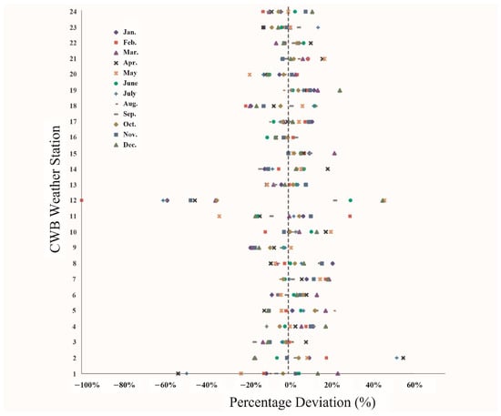 The predicted global radiation was validated for each CWB weather station on the Taiwanese mainland using a cross-validation procedure and TMM data. For the sake of conciseness, only results for the statistical indicator of the MPE, Equation (19), are shown in Figure 2. Figure 2 presents the MPEs of 12 TMMs (from January to December) for 24 CWB weather stations located on the Taiwanese mainland. Except for four stations, Anbu (Station 1 in Table 1 and Figure 1), Zhuzihu (Station 2), Alishan (Station 11), and Yushan (Station 12) which will be elaborated on later, the MPEs for the cross-validation for each weather station fall within (20%, 25%) for all months of each TMY. It is noted that the month here is a TMM which is the representative month between 2004 and 2018 for each CWB weather station. A given TMM at different CWB weather stations is usually selected from different years in between 2004 and 2018. It certainly leads to a more scattering spatial distribution for global radiation among the 24 CWB stations on the Taiwanese mainland for a given TMM as compared to a case under the condition of selecting a specified month of the same year for all 24 CWB stations, which would have a smoother spatial continuity for the global radiation among them. A similar situation was observed for the development of a global-radiation map using a TMY (1985–1999) for Greece [26]. The study showed relatively large deviations and greater scattering between the predicted and observed annual global radiation data for 39 locations with an value of 0.87 (see Figure 2 of [26]).