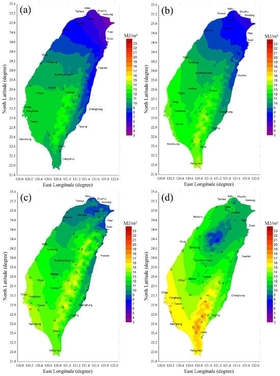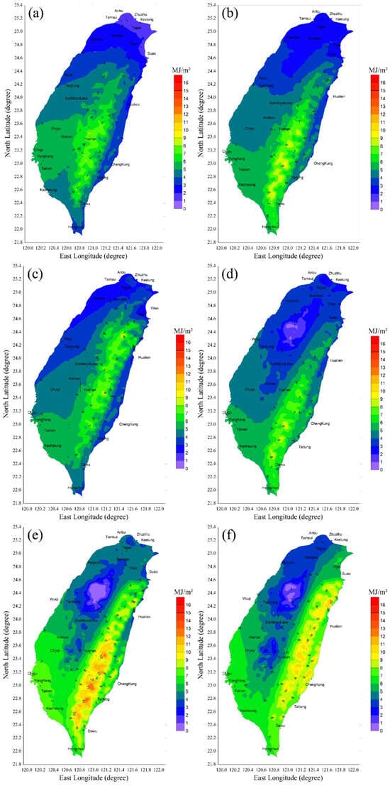 Seasonal trends for the monthly variations in the global radiation (Figure 3) and beam radiation (Figure 5) are very similar. The Northeast Monsoon from November to March dominates the weather in the northeastern Taiwanese mainland. During the monsoon season, moist ocean air is blown southwest-bound and is lifted upward by the Central Mountain Ranges. Therefore, cloudy skies and orographic rain are frequent features in the windward side of the mountains (i.e., the eastern coastland) during the monsoon season. This results in low levels of monthly global and beam radiation in the northern Taiwanese mainland and the eastern coastland during November–March, as, respectively, shown in Figure 3 and Figure 5. Orographic rain sometimes lasts until April on the eastern coastland and results in relatively low monthly beam radiation, as shown in Figure 5d. The Northeast Monsoon has a smaller influence on the monthly global and beam radiation on the leeward side of the Central Mountain Ranges (i.e., the western part of the Taiwanese mainland), as shown in Figure 3d–j and Figure 5e–j, respectively. The relative lower levels of monthly global and beam radiation observed in the regions of mountains and hills in comparison to the regions of plains/basins for the western part of the Taiwanese mainland after the monsoon season are attributed to the altitude factor [28]. It shows significant topographic effects on both global and beam radiation between the western and eastern parts of the Taiwanese mainland during the Northeast Monsoon season. For the other months in a year, the regions to the east (sunrise) side of the Central Mountain Ranges experience higher global radiation and beam radiation than regions to the west (sunset) side, as, respectively, shown in Figure 3e–j and Figure 5e–j. The spatial distributions of the annual results for global radiation and beam radiation are shown in Figure 4. It reveals that the eastern Taiwanese mainland has more solar resources than the western part. It is agreed that solar resources become more abundant as latitude decreases toward the equator. The results in Figure 4 exhibit this trend.