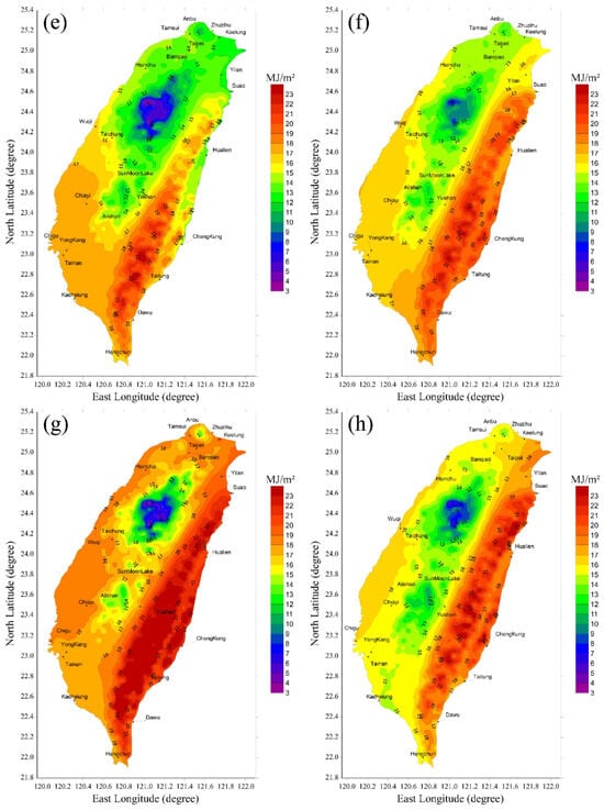 The monthly global radiation (MGR) database for the TMY from 2004 to 2018, derived from 30 CWB weather stations, is based on recent research by Hsieh et al. [5] and is listed in Table 3. Out of these 30 stations, 24 (Stations 1–24, see Figure 1) are situated on the Taiwanese mainland, and their data are utilized to create spatial maps of solar radiation resources. The remaining six stations (Stations 25–30) are positioned on various remote islands, as illustrated in Figure 1.