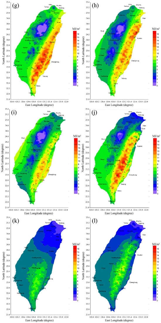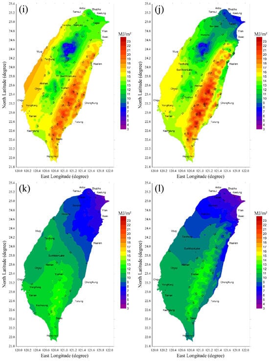 Spatial distributions of monthly global radiation on the Taiwanese mainland for (a) January, (b) February, (c) March, (d) April, (e) May, (f) June, (g) July, (h) August, (i) September, (j) October, (k) November, and (l) December.