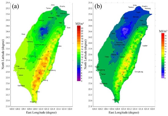 Spatial distributions of annual average daily (a) global radiation and (b) beam radiation on the Taiwanese mainland.