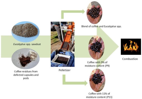 - Mendoza Martinez, C.L.; Sermyagina, E.; de Cassia Oliveira Carneiro, A.; Vakkilainen, E.; Cardoso, M. Production and characterization of coffee-pine wood residue briquettes as an alternative fuel for local firing systems in Brazil. Biomass Bioenergy 2019, 123, 70–77. [Google Scholar] [CrossRef]