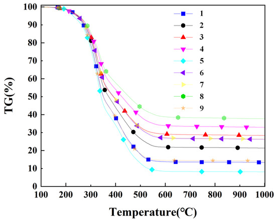 This study used a simultaneous thermal analyzer (METTLER TOLEDO TGA/DSC1) for the thermogravimetry (TG) experiment. The test mass of the sample was set at 5 ± 0.5 mg. The reaction atmosphere was air, with an 80 mL/min flow rate. The heating process was divided into two stages: the drying stage (50–105 °C) and the experimental stage (105–1000 °C), with a heating rate of 40 °C/min.