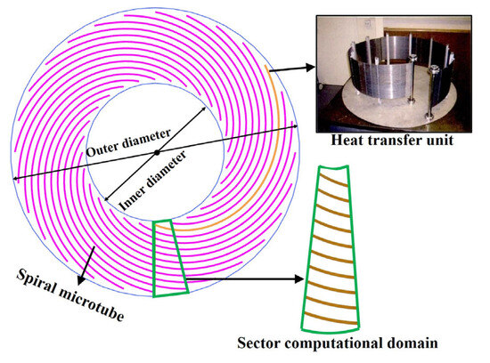 The precooler in SABRE was manufactured by REL and comprised 28 heat exchange units, with an outer diameter of 900 mm and an inner diameter of 430 mm [1]. Each spiral precooling unit encircled the central axis and formed a structure with circumferentially symmetrical arrangement (shown in Figure 1). Meanwhile, each heat exchange unit consisted of four staggered microtubes arranged as a row of tube bundles. Each heat exchange microtube had a diameter of 1 mm, with a spacing of 2 mm between adjacent microtubes (measured as the distance between their centers). Due to its outer diameter being ten times larger than its wall thickness, the microtube can be simplified as a thin-wall cylinder following Den Hartog’s guideline [17]. When operating within the engine, the hot air flows radially inward to the precooler while liquid nitrogen serves as the coolant flowing through spiral microtubes to precool the hot air.
