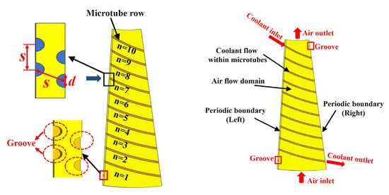 The sector computational domain of the precooler unit employed periodic boundary conditions, with a user-defined function (UDF) controlling the temperature at both the inlet and outlet. This ensures that the temperature at each subsequent tube’s inlet matches that of its preceding tube’s outlet. Figure 3 illustrates the method for establishing these periodic boundary conditions, involving “groove” symmetrically at the first “inlet” and last “outlet” positions of the microtubes. The groove depth is 0.1 mm, which can be disregarded compared to the width of the entire air domain, but allows for periodic symmetry on both sides in this sector computational domain