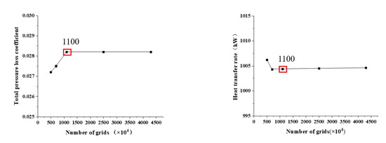 In order to validate the grid independence, five sets of grids were generated by varying only the overall grid size, while maintaining consistent model, boundary conditions, and turbulence model settings. The numerical simulation results are presented in Figure 4. Upon reaching a grid count of 11 million, further increasing the number of grids had negligible impact on both the total pressure loss coefficient of the precooler unit and heat transfer rate. As a result, a total grid number of 11 million was ultimately selected.