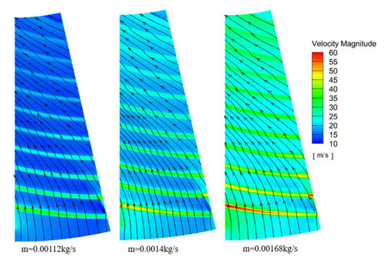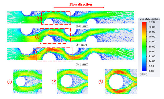 In addition to these findings, Figure 21 presents distributions of airflow velocity and spatial streamlines among microtubes within the precooler units with different tube diameters. The results demonstrated that an increase in tube diameter enhanced airflow acceleration within the narrow channels formed by microtubes while reducing wake vortex zones accordingly, which was consistent with the analysis based on Figure 19 and Figure 20.