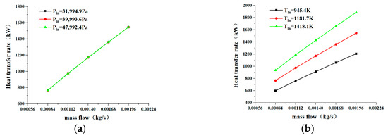 The coupling effects of inlet total pressure, inlet total temperature, and air massflow rate on the total pressure loss coefficient and heat transfer rate of the precooler unit are depicted in Figure 14 and Figure 15. Both the total pressure loss coefficient and the heat transfer rate of the precooler unit exhibited approximately linear increasing trends with an increase in air massflow rate. Moreover, an increase in inlet total pressure attenuated the monotonous rise of the total pressure loss coefficient, while it had no impact on the change in heat transfer rate during an increase in air massflow rate. In contrast, an increase in inlet total temperature contributed to increases in both the total pressure loss coefficient and heat transfer rate of the precooler unit, with a larger increment observed for the latter. Specifically, at any given massflow rate in Figure 15a, a reduction of the inlet total pressure to 31,994.9 Pa resulted in an approximate increase of 32.6% in the total pressure loss coefficient compared to the condition with an inlet total pressure of 39,993.6 Pa; while an increase in the inlet total pressure to 47,992.4 Pa led to a decrease of about 21.2%. Similarly, for a given massflow rate, shown in Figure 14b and Figure 15b, lowering the inlet total temperature to 945.4 K caused a decrease of approximately 17% in the total pressure loss coefficient and a decline of about 22% in heat transfer rate compared to the condition with an inlet total temperature of 1181.7 K. Conversely, raising the inlet total temperature to 1418.1 K resulted in an increase of around 17% in the total pressure loss coefficient and an enhancement of about 22% in the heat transfer rate.
