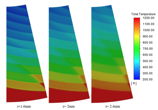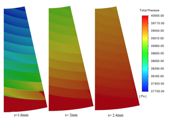 The distributions of total pressure and total temperature on the cross-section of the precooler unit with different tube spacing are shown in Figure 16 and Figure 17, respectively. It is worth noting that an increase in tube spacing (keeping inlet condition, tube diameter, and number of tube rows constant) inevitably led to an enlargement of the throughflow area perpendicular to the flow direction in the computation domain. This resulted in a reduction in airflow velocity and subsequently decreased the total pressure loss within the precooler, leading to a higher outlet total pressure, as depicted in Figure 16 for cases with larger tube spacing. However, it should be noted that increasing tube spacing also contributed to an elevated outlet total temperature and decreased convective heat transfer coefficient within the precooler unit, as illustrated in Figure 17, due to decreasing airflow velocity.