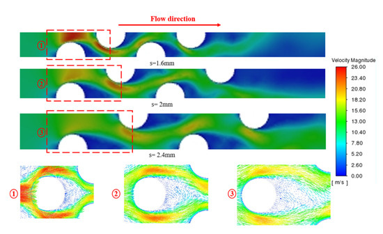 The distributions of airflow velocity and spatial streamlines among microtubes within the precooler unit with different tube spacing are shown in Figure 18. As the tube spacing increased from 1.6 mm to 2.4 mm, the flow accelerations between tubes have been weakened significantly, while the wake vortex zone behind each microtube (corresponding to the low-velocity zone) expanded gradually. Consequently, this led to a weakening of the overall heat transfer effect of the precooler. However, although there was an increase in flow losses due to the growing wake vortex zones, these losses were much smaller compared to the total pressure losses caused by airflow interacting with the walls of microtubes. As a result, there was a noticeable reduction in overall total pressure losses occurring due to reduced flow accelerations between tubes.