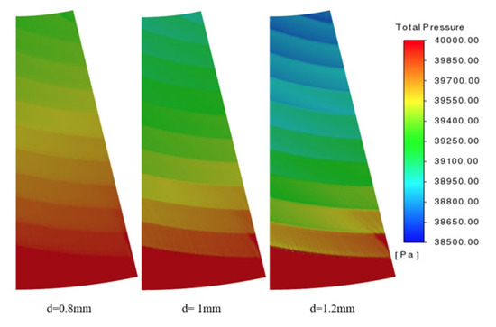 The distributions of total pressure and total temperature on the cross-section of the precooler with different tube diameters are illustrated in Figure 19 and Figure 20, respectively. While keeping the inlet condition, tube spacing, and number of tube rows unchanged, an increase in tube diameter resulted in corresponding rises in both total pressure loss coefficient and outlet total pressure. This phenomenon can be attributed to a reduction in effective throughflow area of hot air relative to an increase in flow velocity between microtubes, leading to significant increases in airflow resistance and convective heat transfer coefficient within the precooler unit. Consequently, smaller outlet total pressure values along with lower outlet total temperatures were observed in all three cases.