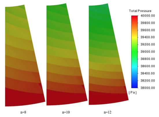 Secondly, the inlet total pressure was varied to investigate its impact on the overall performance of the precooler unit, while keeping the inlet total temperature and air massflow rate constant. The distributions of total pressure and total temperature on the cross-section of the precooler unit under different inlet total pressures are illustrated in Figure 10 and Figure 11, respectively. As the inlet air total pressure increased (with relative increments of 20%), there was a corresponding increase in air density, resulting in gradual reductions in both inlet air velocity and flow resistance. Consequently, this led to a decrease in the total pressure loss coefficient of the precooler unit and, ultimately, produced higher outlet values for total pressure (as shown in Figure 10). Conversely, variations in inlet total pressure had only negligible effects on both the distribution features of total temperature, as well as its outlet values observed from Figure 11.