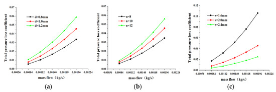 Coupling effects of different geometric factors on total pressure loss. (a) Interactions of tube diameter and massflow; (b) Interactions of number of tube rows and massflow; (c) Interactions of tube spacing and massflow.
