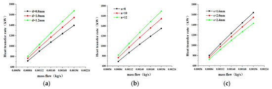 Coupling effects of different geometric factors on heat transfer rate. (a) Interactions of tube diameter and massflow; (b) Interactions of number of tube rows and massflow; (c) Interactions of tube spacing and massflow.