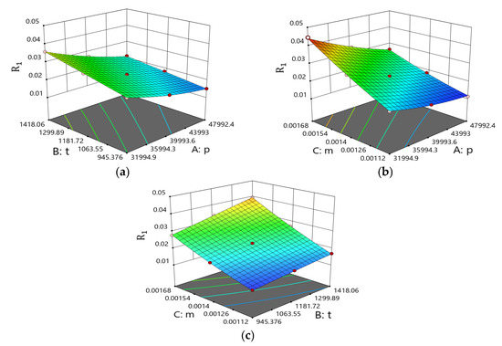 Figure 27 illustrates the response surfaces of the total pressure loss coefficient under different inlet conditions. All three interaction items (AB, AC, BC) exerted significant influences on the total pressure loss coefficient. Specifically, decreasing both air massflow rate and inlet total temperature, as well as increasing inlet total pressure, contributed to reducing the total pressure loss coefficient. Table 3 and Figure 27 indicate that the p-values of interaction terms AB, AC, and BC were all less than 0.05, indicating their significance on the total pressure loss coefficient. Although considering interactions between two factors resulted in a curved surface shape with certain curvature, all these interaction terms had reducing significance on overall total pressure loss, compared with the impacts of single-factor effects.