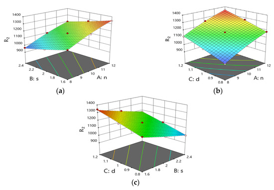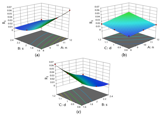 Figure 30 illustrates the response surfaces of heat transfer rate with varying geometric factors. As indicated in Table 9, all the p-values for the three interaction terms (AB, AC, and BC) were found to be greater than 0.05, suggesting their insignificance in relation to the heat transfer rate. Additionally, the relatively flat shapes in Figure 30 further confirmed that these three interaction terms had minimal impact on the heat transfer rate.