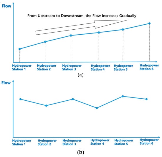 According to the normal runoff logic, due to the interval inflow, the outflow of upstream reservoirs in cascade reservoirs should be less than the inflow of downstream reservoirs, that is, the flow increases gradually from up to down, and the inflow in each interval is positive, as shown in Figure 1a. In some cascade reservoirs, the inflow of downstream reservoirs is less than the outflow of upstream reservoirs, resulting in a negative interval inflow, as shown in Figure 1b, so the runoff process of the basin needs to be corrected.