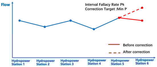 When correcting the curves of the first or last hydropower station of the cascade, only one interval needs to be considered. The optimization simulation is carried out with the minimum fallacy rate of the interval as the goal, and the curves are updated, as shown in Figure 2. When correcting the curves of a hydropower station in the middle of the cascade, it affects the fallacy rates of the upper and lower intervals. The fallacy rate of the two intervals should be considered comprehensively, and the optimization is generally aimed at the minimum sum of squares.