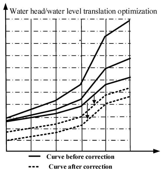 Translation optimization according to different water heads/levels is the further improvement of the overall translation optimization method. Considering the curve deviations are different under different water heads or water levels, the NHQ curve of the hydropower station and the gate curve are corrected according to different water heads/levels, that is, the curves under different water heads/water levels are multiplied by different coefficients to perform a more refined correction. The specific correction details are shown in Figure 8. The specific steps of its correction are similar to the idea of overall translation. The difference is that this method selects the different coefficients for the curves at different head or water levels, respectively, and determines the optimal coefficients of each head/water level according to the interval fallacy rate obtained after recalculation.