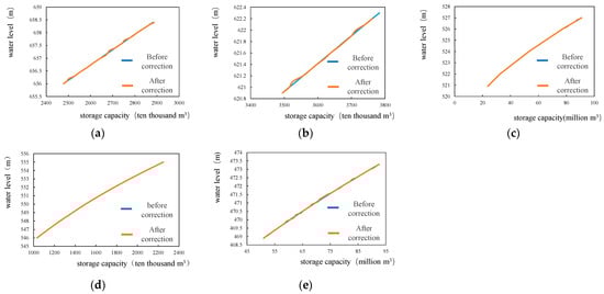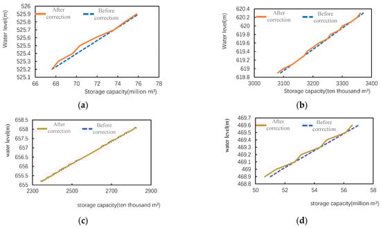 The single point discrete optimization method is used to correct the NHQ curve, discharge curve and capacity curve of each power station. After correction, the interval flow fallacy rate obtained by the water affairs calculation module is shown in Table 4 below. Taking the reservoir capacity curve as an example, the capacity curve of each reservoir before and after correction is shown in Figure 10. In order to facilitate the comparative analysis of the differences before and after correction, the following figures only draw the modified section of the capacity curve. It can be seen that the revised curve reduces the capacity at the same water level, which is consistent with the phenomenon of reservoir sedimentation after reservoir operation, indicating the rationality of the correction.