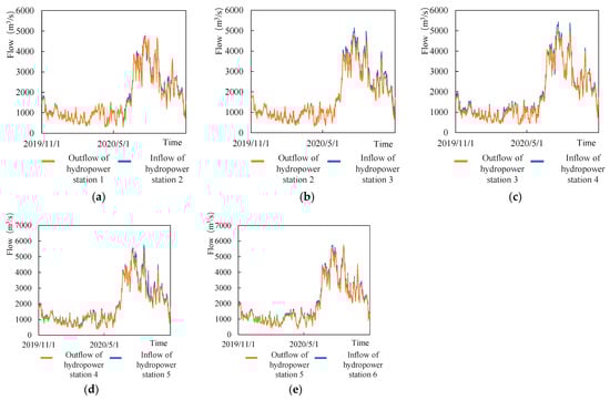 Comparison diagram of each hydropower station between inflow and upstream outflow. (a) Comparison of station 2’s inflow and upstream outflow; (b) Comparison of station 3’s inflow and upstream outflow; (c) Comparison of station 4’s inflow and upstream outflow; (d) Comparison of station 5’s inflow and upstream outflow; (e) Comparison of station 6’s inflow and upstream outflow.