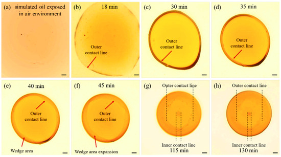Contraction behaviors of contact line in SLNs at different time. ((a) Simulated oil wrapped in air, (b–h) position of oil-water-solid three-phase contact line at different times). Roportional line segment represents 200 µm [26].